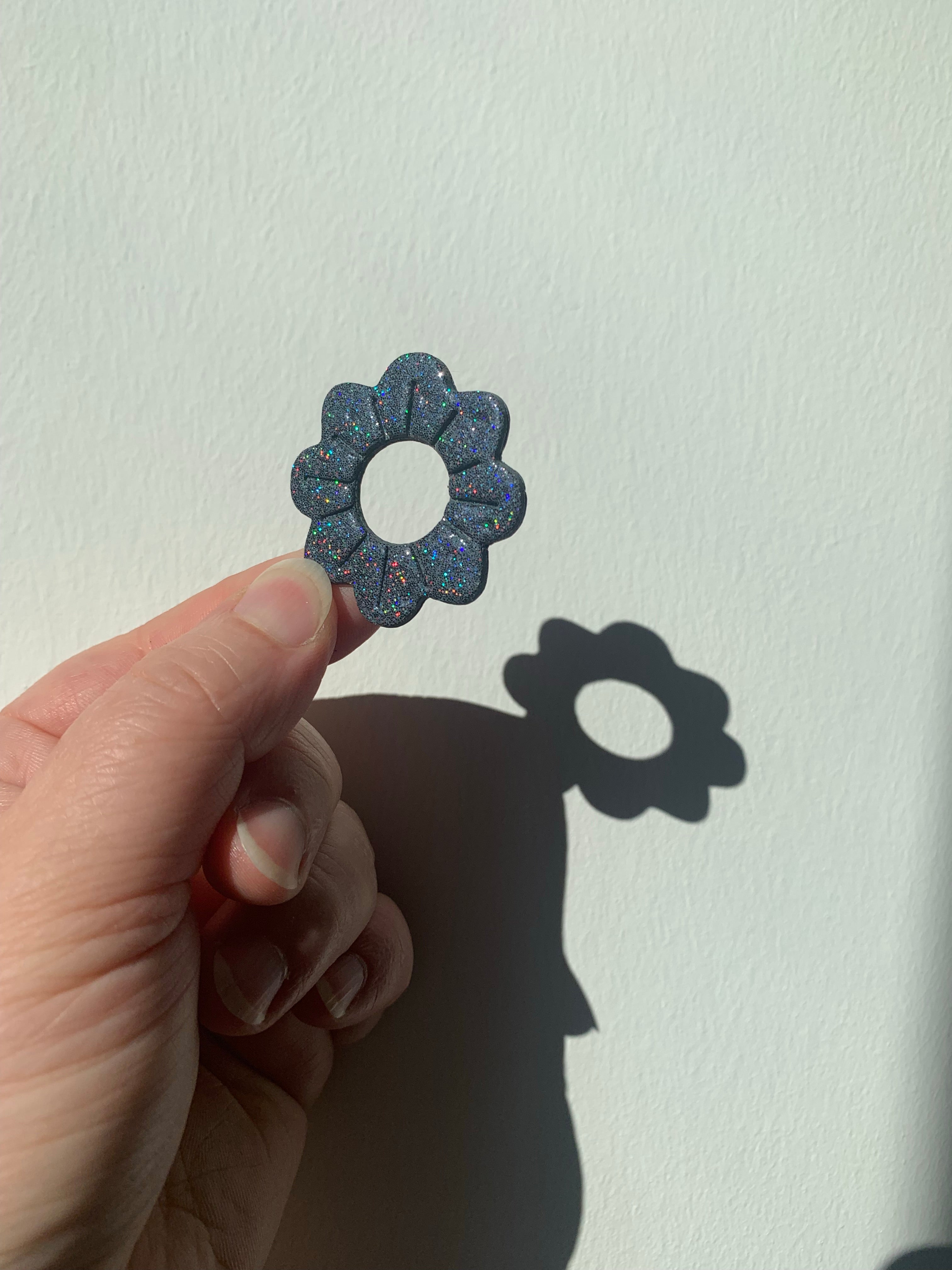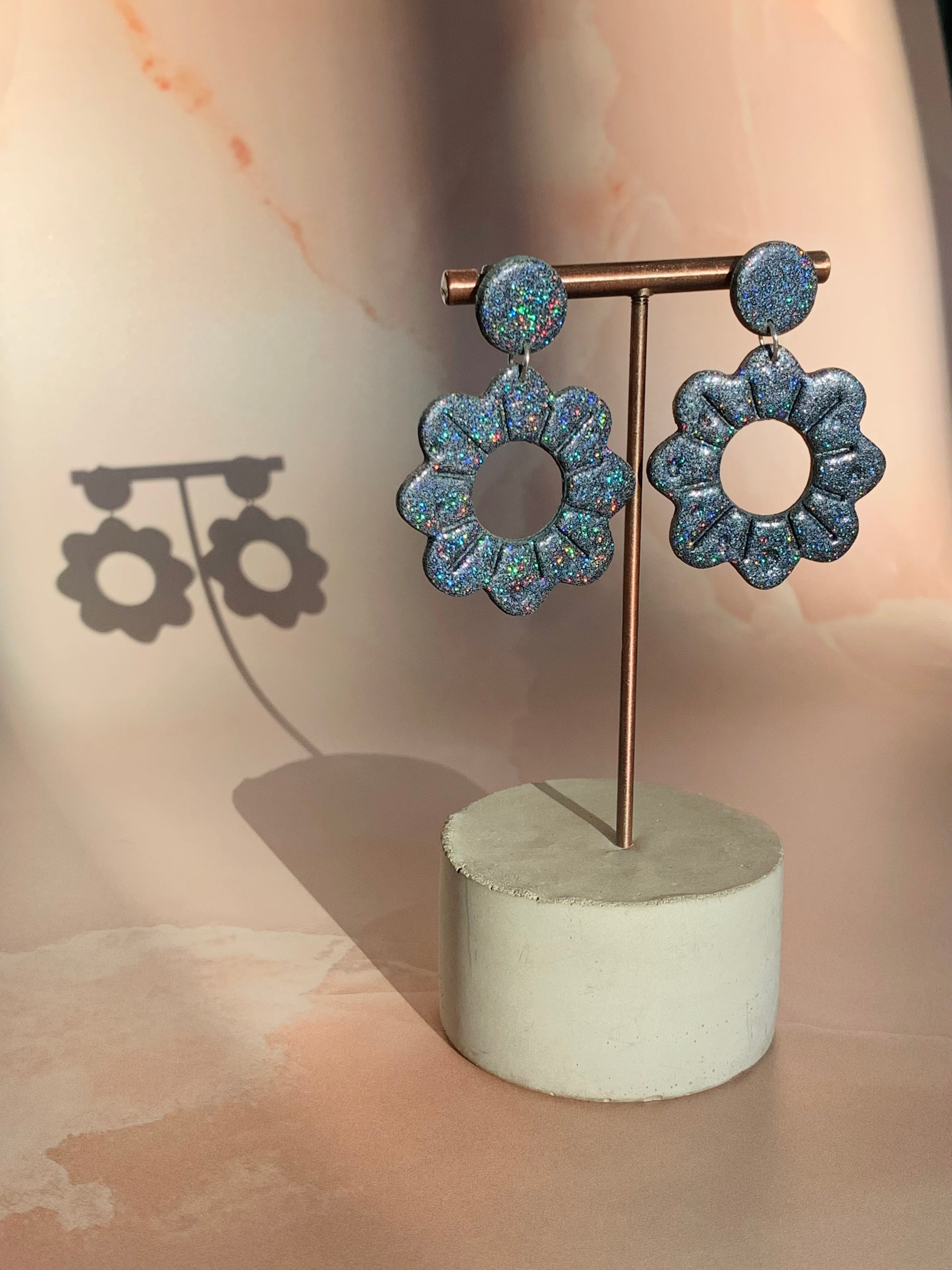 The Holo Daisies feature holographic polymer clay flower shapes with holographic circle studs. Stainless steel post with pushback enclosure. The photos do not do them justice, they are so pretty and so much fun!